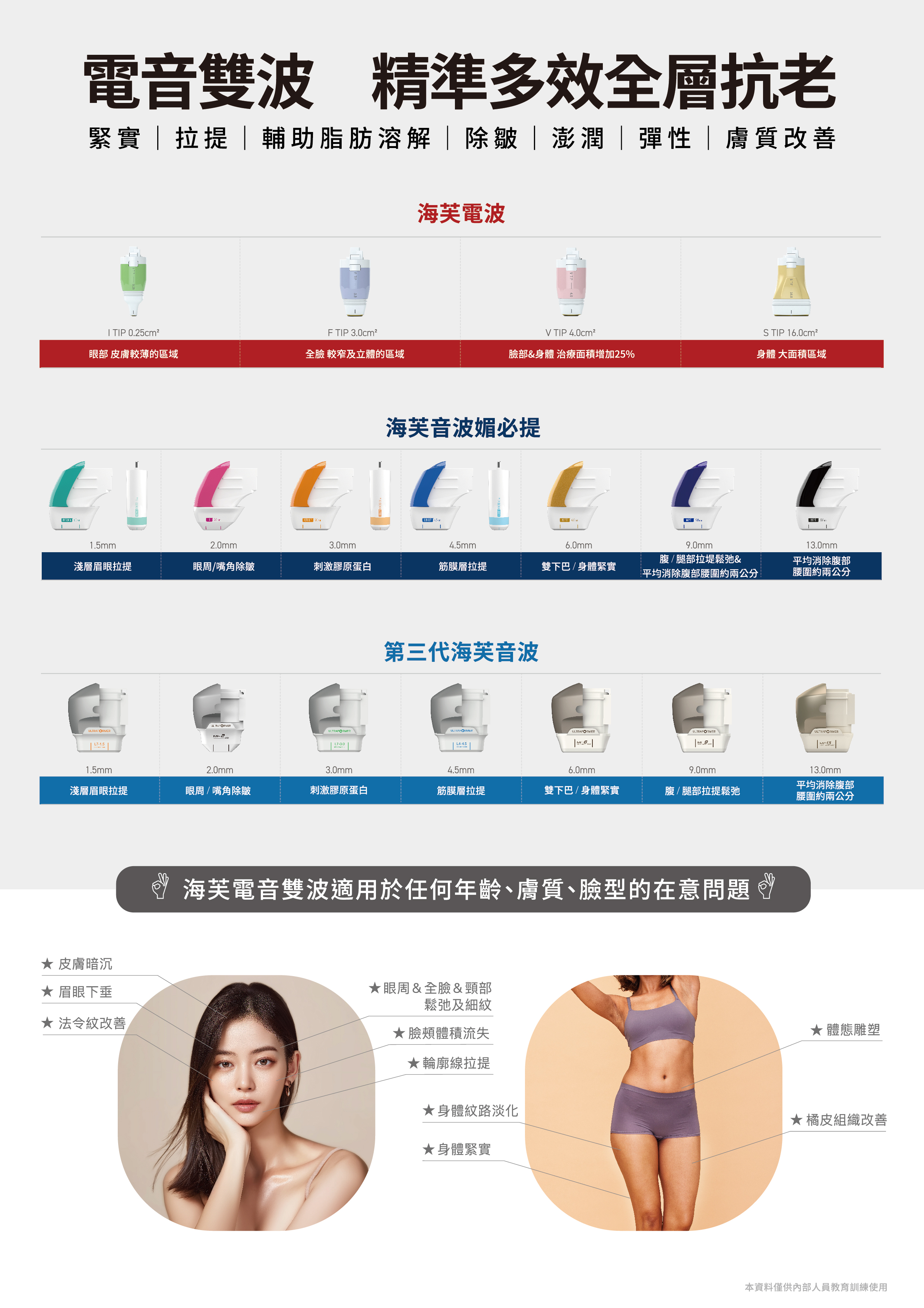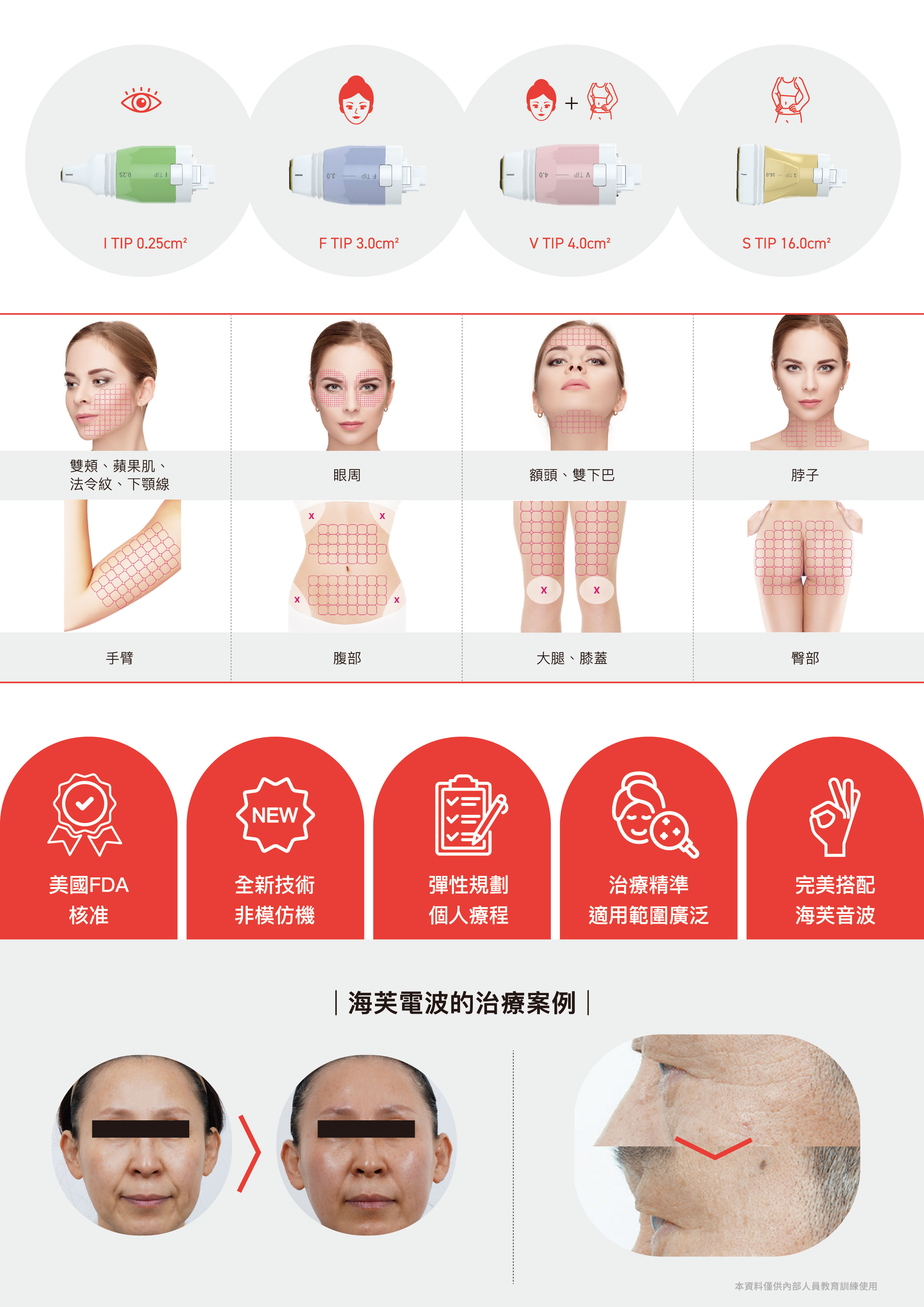 多款探頭設計可針對不同肌膚部位與厚度調整治療深度,打造專屬的緊實方案。探頭不鎖發數可以根據每個人的預算需求做規劃
