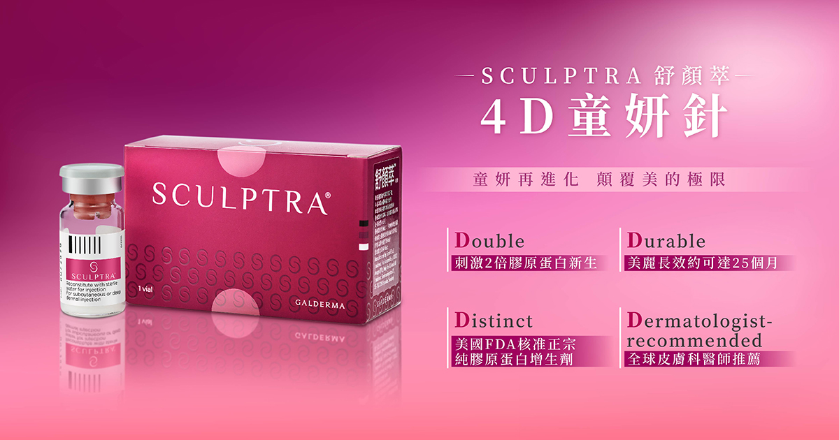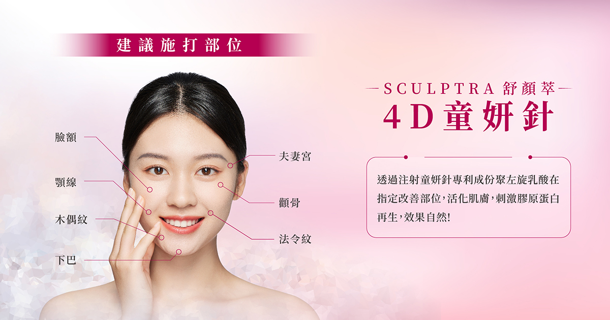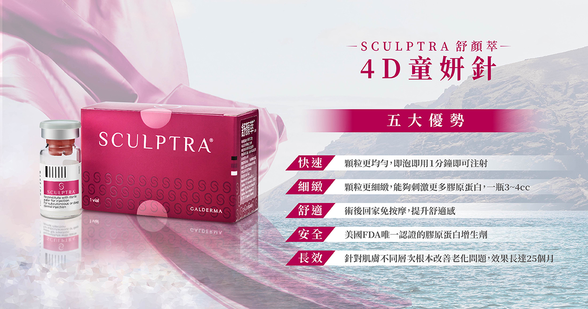舒顏萃4D童妍針(Sculptra)來自歐洲,是一種含有聚左旋乳酸(PLLA, Poly-L-Lactic Acid)的注射型膠原蛋白增生劑,不同於玻尿酸等立即填充型產品,它透過漸進式刺激自體膠原蛋白增生,使肌膚恢復彈性與飽滿感。
