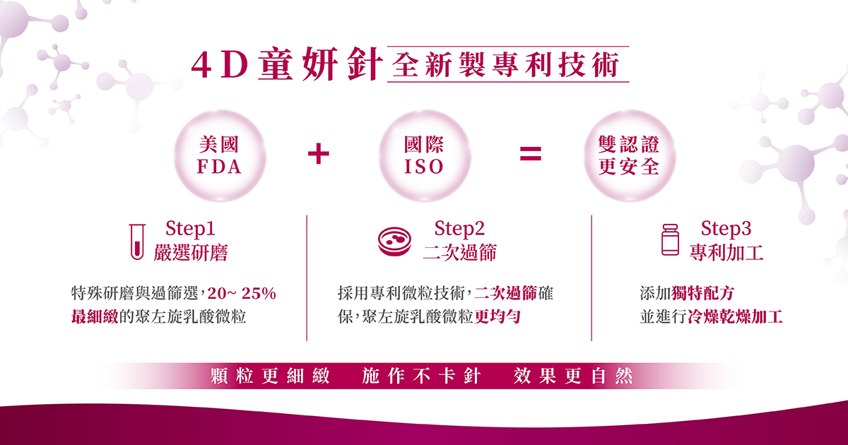 「4D童妍針」之名意指它從立體輪廓(3D)再加上時間(第4度空間)進行肌膚抗老,能夠在數周至數月內,逐步重建肌膚結構,不僅填補凹陷,更同步緊實肌膚、重塑年輕輪廓,達到內建式抗老效果。