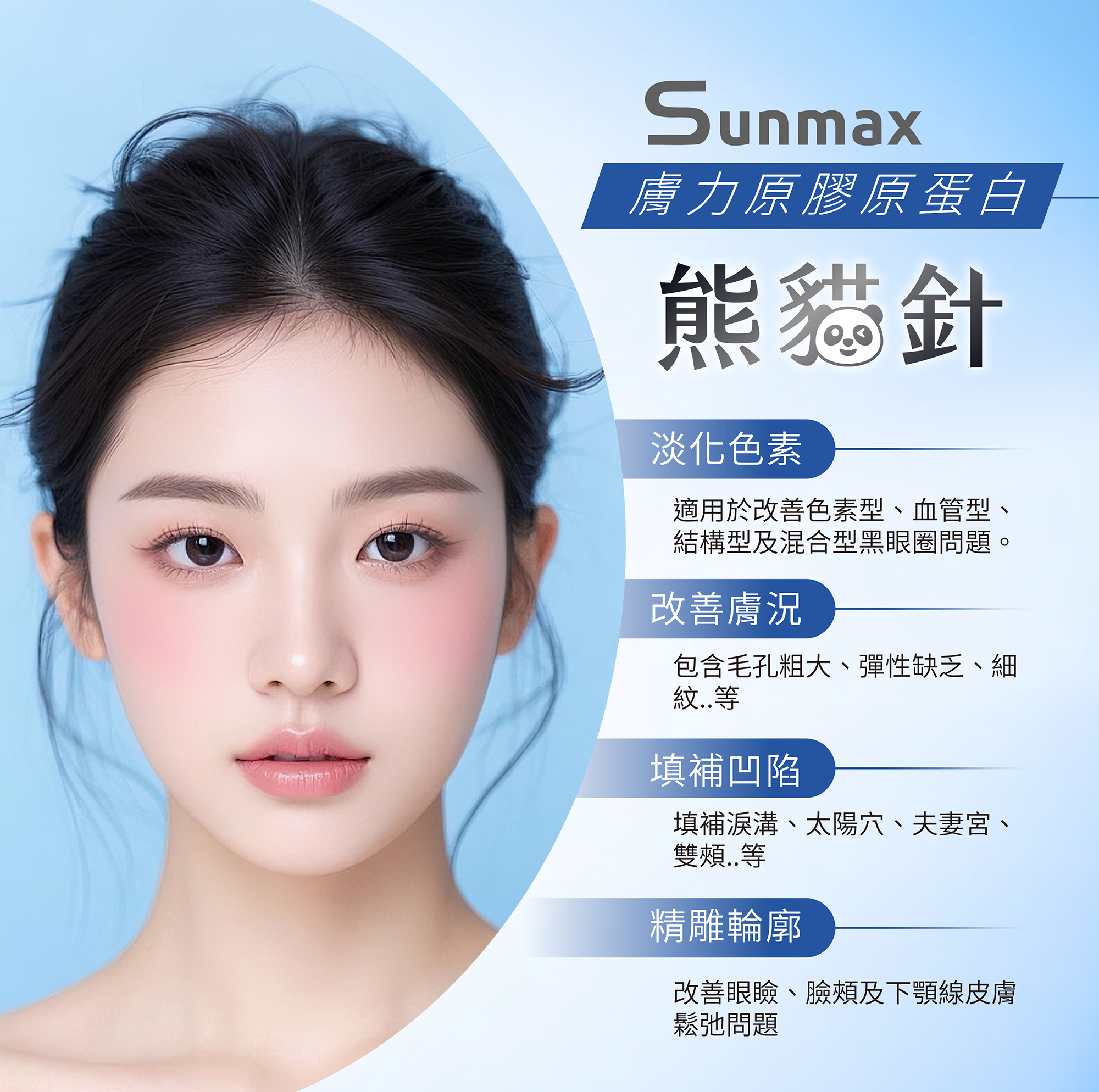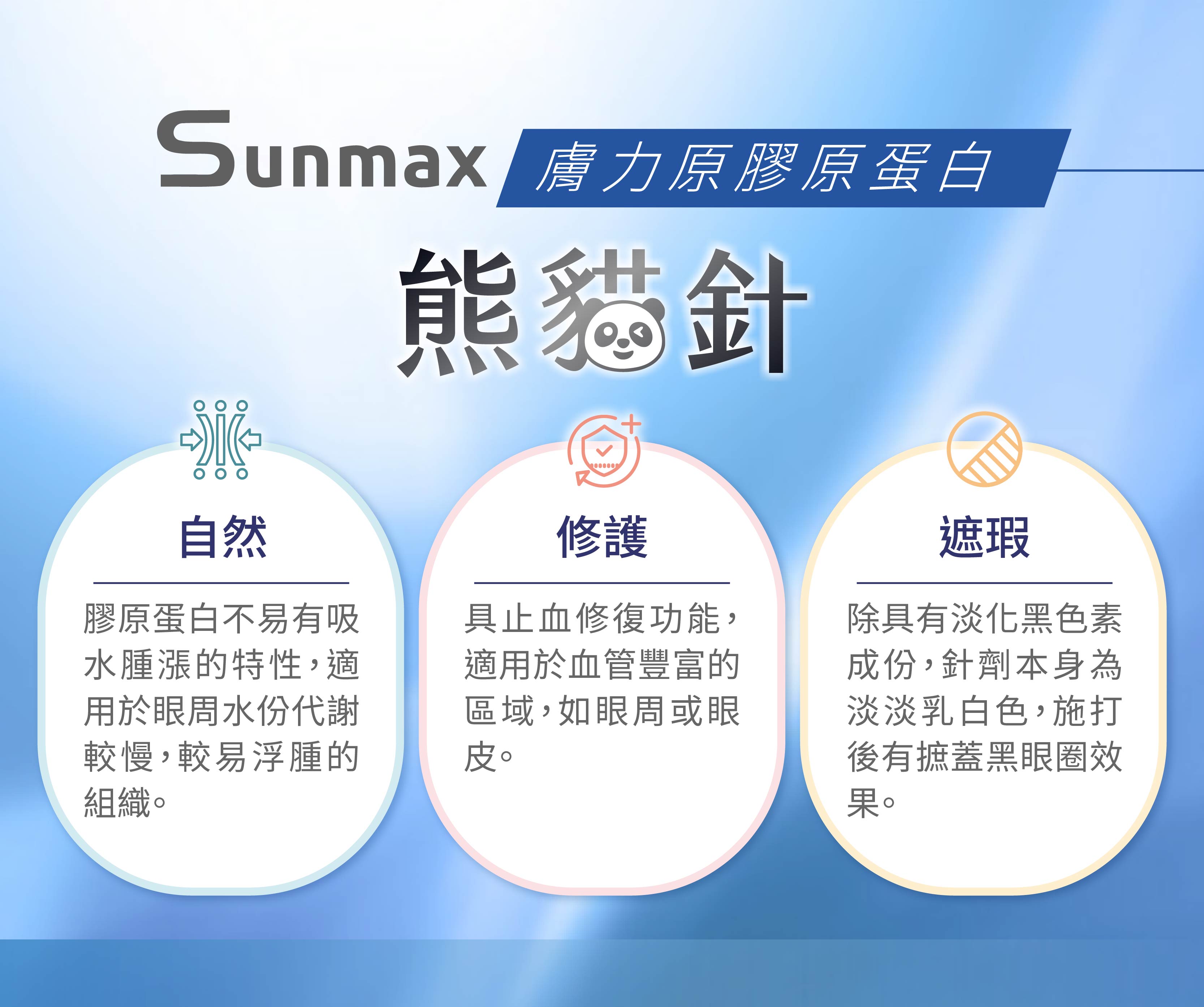 「熊貓針」是能針對黑眼圈、淚溝凹陷與眼周細紋等問題的微整形注射療程,主要成分為高純度的第I型膠原蛋白(atelocollagen),與人體自有的膠原蛋白相容性極高(達99.9%),因此安全性佳,能自然被代謝吸收。
