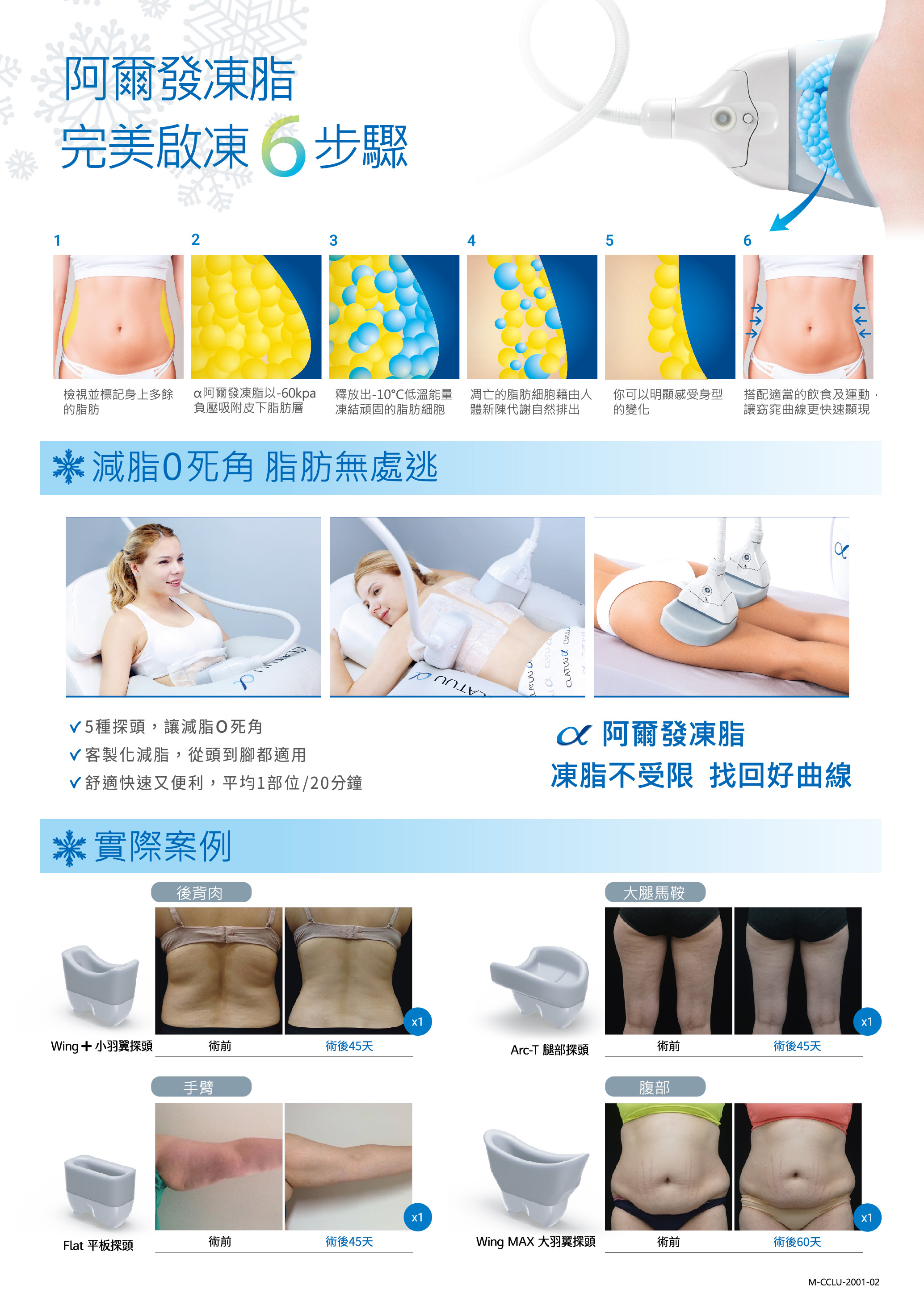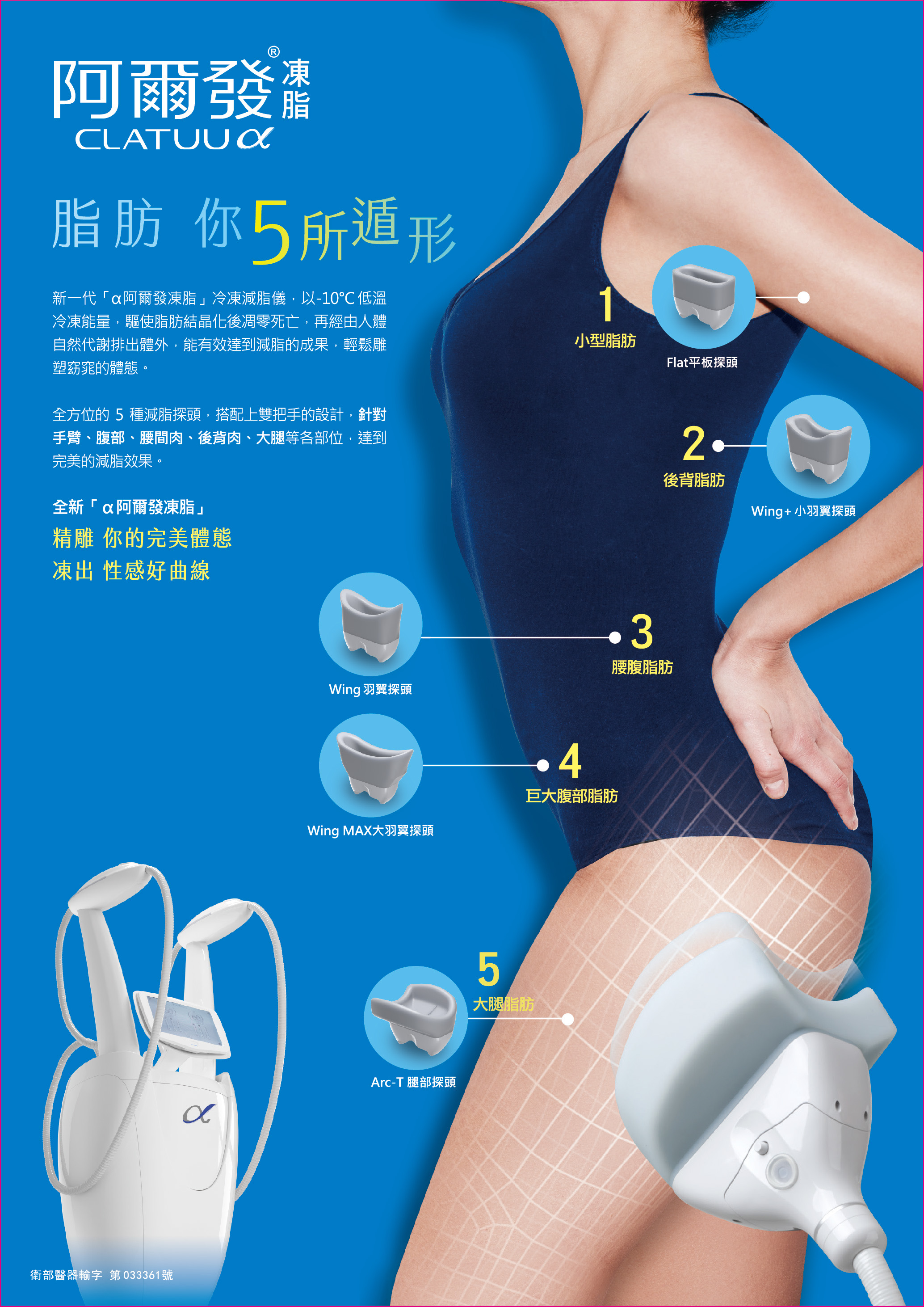 Alpha阿爾發冷凍減脂是一種無創式脂肪雕塑療程,透過各式探頭將目標部位吸附固定,再施以約-5°C至-10°C的恆溫冷凍技術,使脂肪細胞經過冷卻後進入自然凋亡的過程。這些被「凍死」的脂肪細胞會經由身體代謝系統逐漸排出體外,過程自然且效果穩定,無需恢復期。