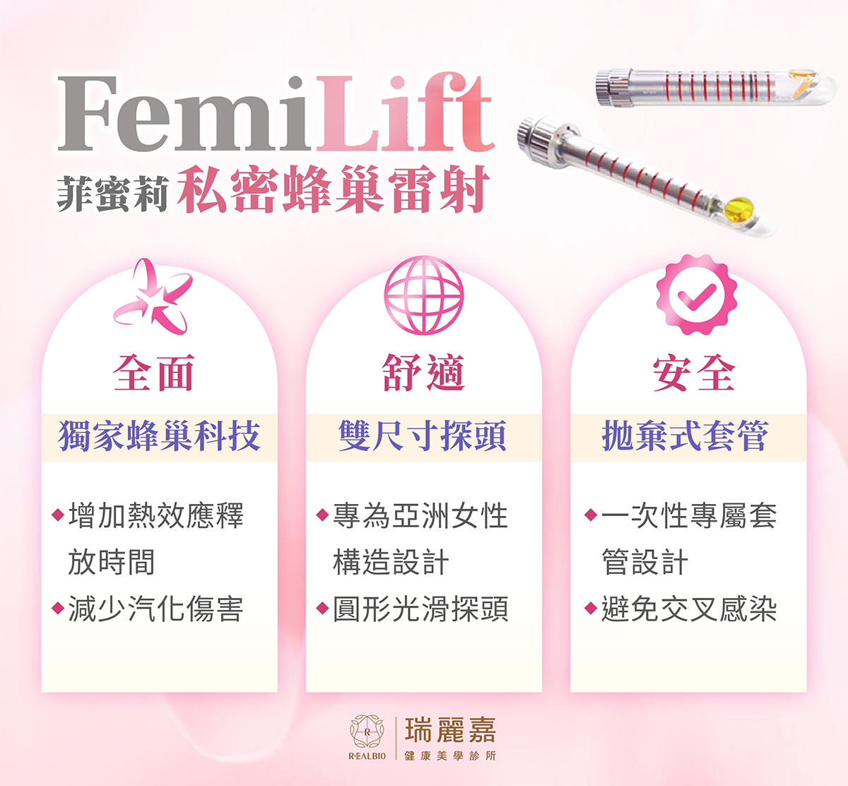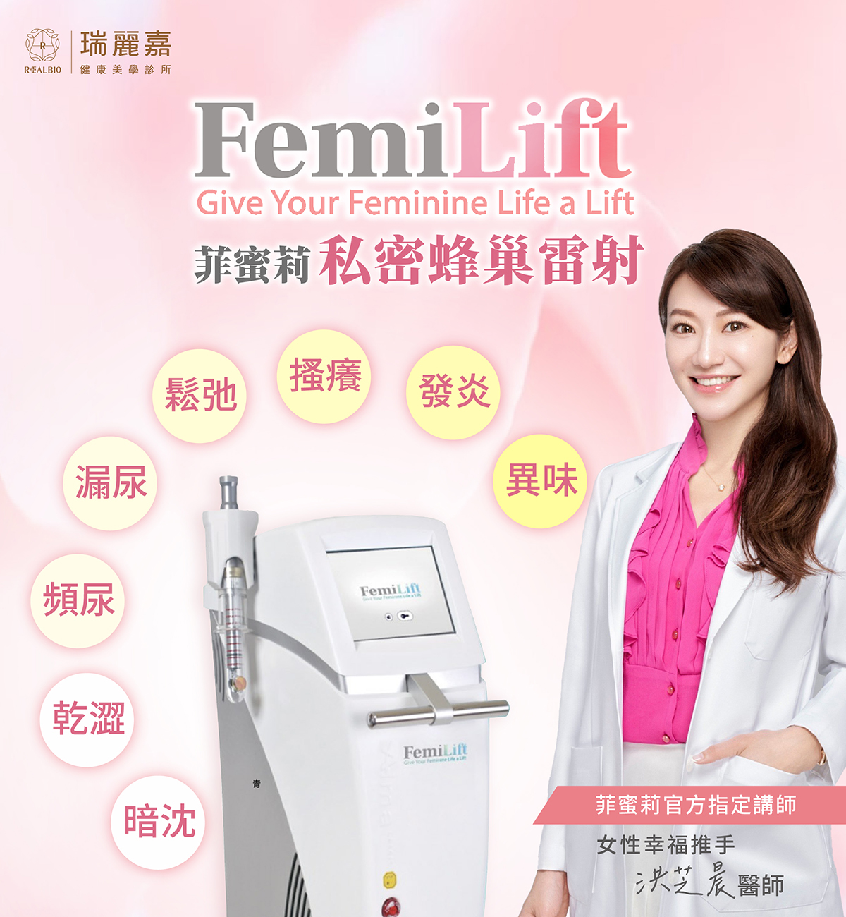像是打個噴嚏或咳嗽不小心就漏尿,私密處搔癢、 頻尿、性生活時感覺乾澀不舒服,這些困擾讓不只讓人不自在,也會影響社交生活或自信。FemiLift菲蜜莉雷射就是專為解決這些問題而設計的私密雷射療程。這項療程能有效刺激私密部位的膠原蛋白生成,恢復緊緻感與彈性,改善陰道乾澀和輕微漏尿,讓妳不僅外在重拾美麗,內心也充滿自信。透過FemiLift菲蜜莉雷射,妳可以輕鬆告別這些煩惱,找回最自然、最健康的自己!