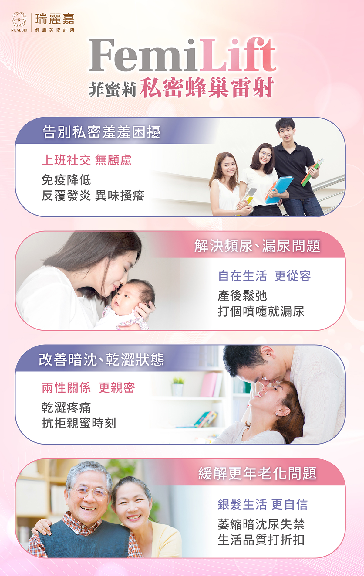 產後的陰道鬆弛、更年期的陰道萎縮及乾澀、陰部暗沉,尿失禁問題、想改善性生活滿意度者。